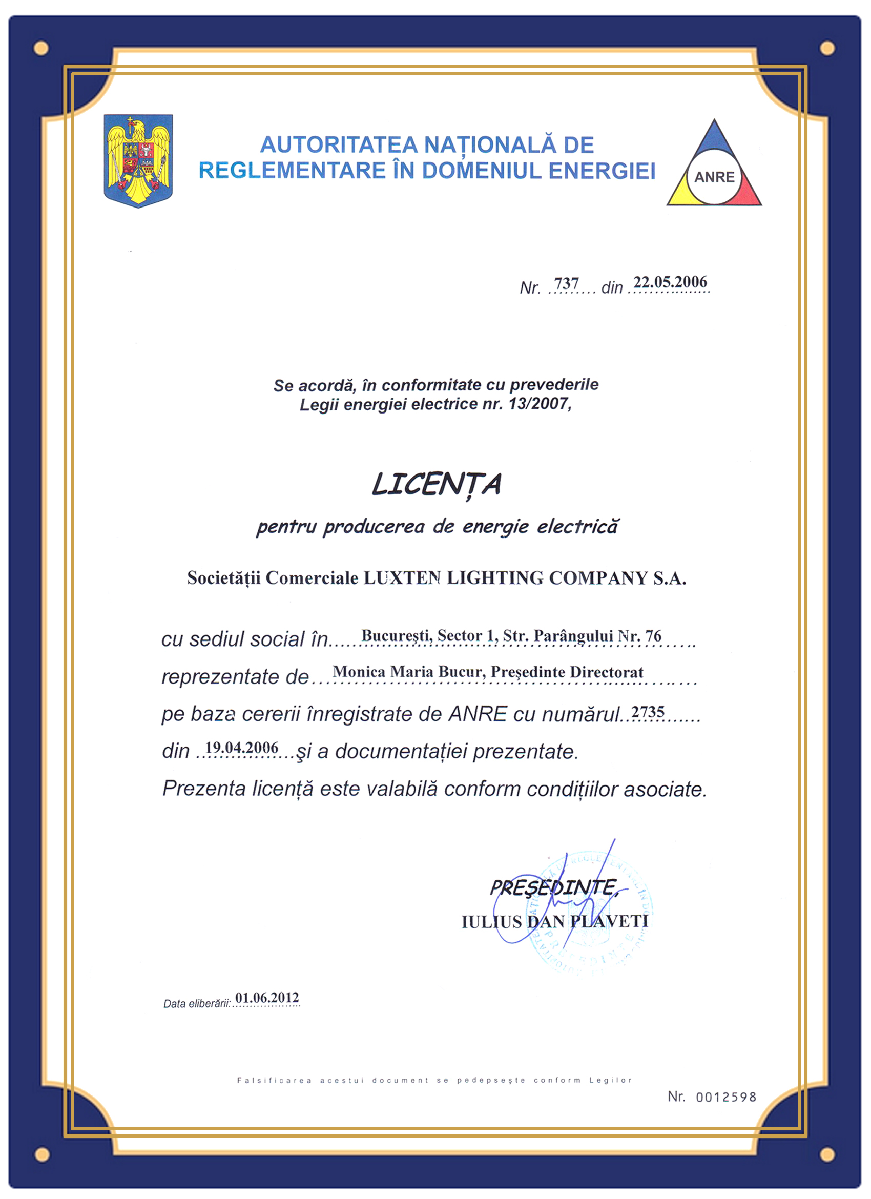 Incepand din anul 2006, in baza Licentei nr. 737/22.05.2006 acordata de catre ANRE (Autoritatea Nationala de Reglementare in Domeniul Energiei), S.C. Luxten Lighting Company S.A. activeaza ca producator de energie electrica din surse regenerabile de energie.